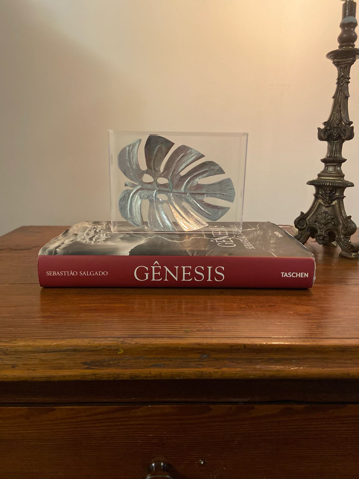 Caixa de acrílico decorativa com folha de Costela de Adão em alumínio.